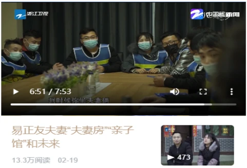 2月19日下午,以蜜桃传媒新员工易正友夫妻千里入职双环为主题拍摄、制作的专题片《易正友夫妻的“夫妻房”“亲子馆”和未来》在浙江卫视正式开播,受到了社会广泛关注,当天点击量超过13万次。